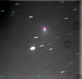 | Luego de varias noches de muy mal seeing esta madrugada pude al fin hacer unas doscientas tomas del tan nombrado por estos días, el cometa 103P Hartley. Con el equipo actual, GSO 8" f/4 y CCD Meade DSi . Cuadros de 30seg c/u. Magnitud 5,4 (un lujo!) |